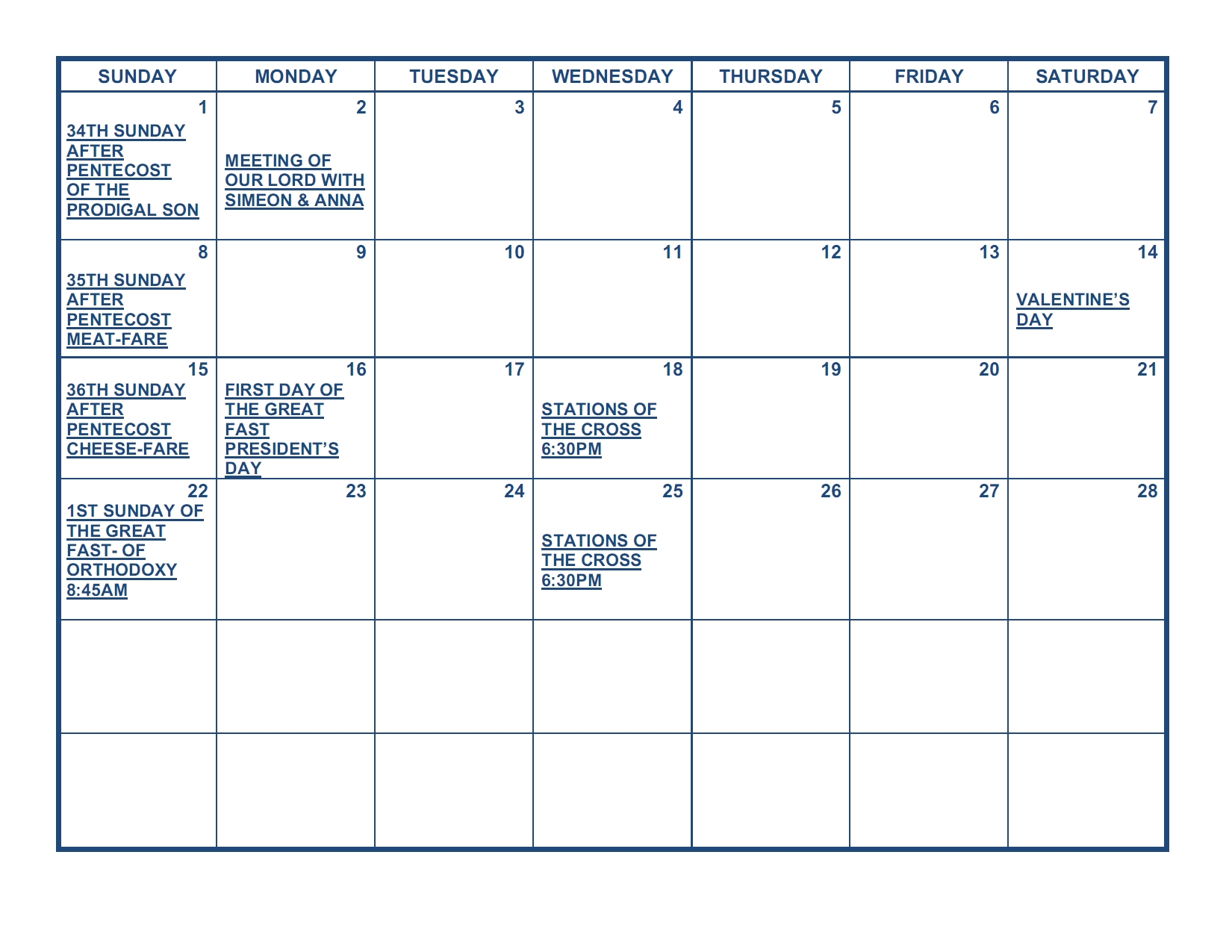 Events Calendar for February 2026