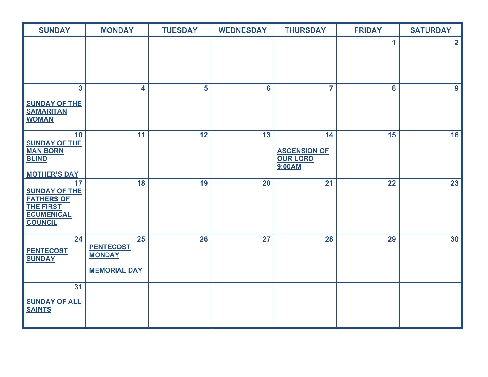 Events Calendar for May 2026